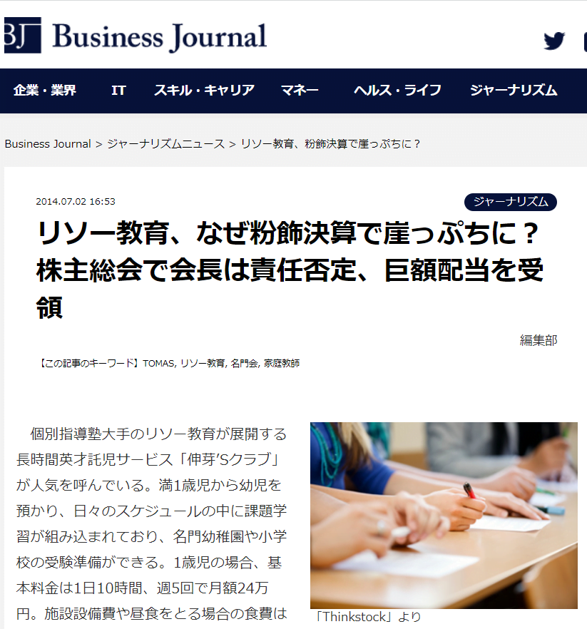 このリソー教育、という会社が過去に粉飾決算をして会長が多額の配当金を受領していた、ってことがこのキーワードでいまだに引っ張られているようですね。